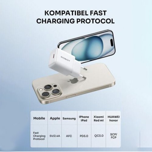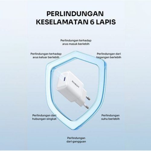 Brand : ROBOT Max. Output Power: 20W Output: Type C Input: AC 100-240V~, 50-60Hz, 0.6A Max Type C Output: 5V/3A, 9V/2.22A, 12V/1.67A Keunggulan: 1. Output 3A | 20W 2. Kecil Dan Portable 3. Pengisisn Daya yang aman dan cepat 4. Battery Protection 5. Kompatible Fast Charging Protocol 6. 6 Proteksi Keamanan - Perlindungan terhadapa arus masuk berlebihan - Perlindungan dari tegangan berlebihan - Perlindungan suhu berlebih - Perlindungan dari gangguan - Perlindungan dari hubungan singkat - Perlindungan terhadap arus keluar berlebih
