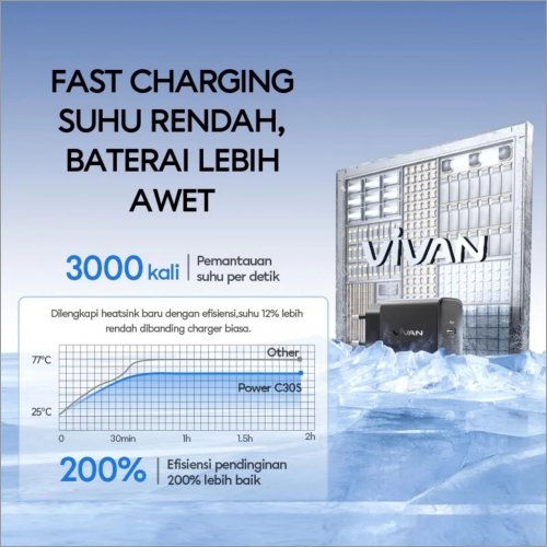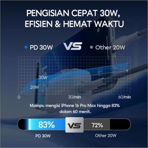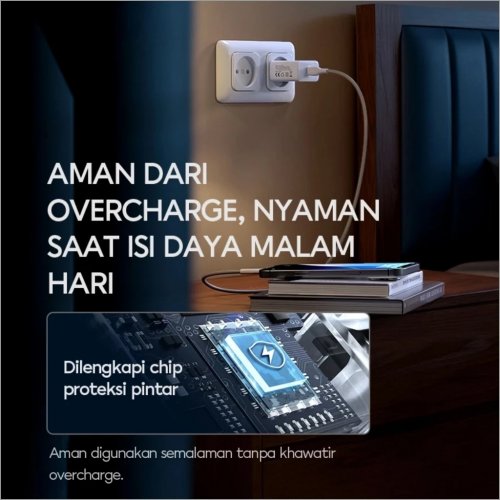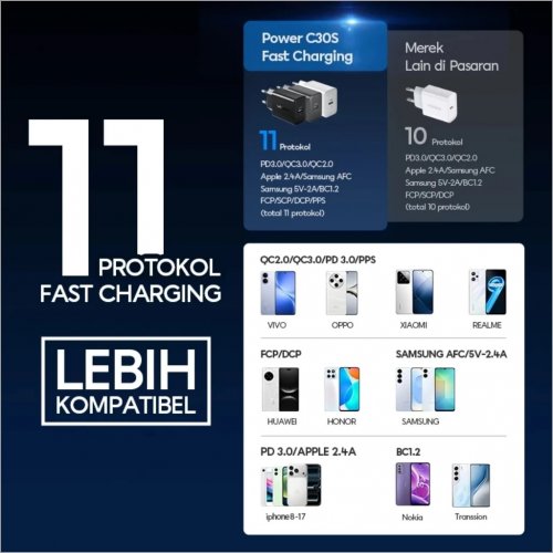 Design Mini Charger yang sangat compact Memiliki Fitur 6 Safety Protection ( Perlindungan terhadap suhu, tegangan, arus listrik yang berlebih ) Output Type C 30W Daya 30W Super Fast Charging Power Delivery 3.0 Quick Charge 3.0
