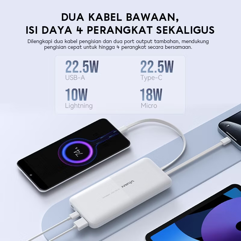 Pengisian cepat dua arah 22.5W, dapat mengisi daya perangkat maupun mengisi ulang power bank dengan cepat 2 input dan 4 output, mendukung USB-A, Type-C, Micro, dan Lightning