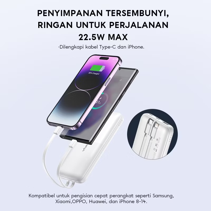 Penyimpanan kabel tersembunyi, kabel bawaan tersimpan rapi di bodi power bank