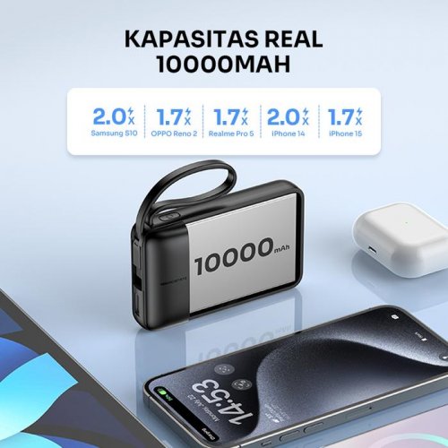 1. Powerbank mini dengan real kapasitas 10.000mAh 2. Mendukung pengisian cepat pada perangkat/gadget 3. Terintegrasi dengan kabel Type-C yang dapat dijadikan strap tali gantung 4. Ukuran kecil, mini dan ringan sehingga mudah dibawa beraktivitas 5. Dapat mengisi perangkat secara bersamaan sekaligus Silahkan Bertanya Ke Costumer Service Mengenai Produk^^ Kelengkapan : 1 x Robot Powerbank Mini RT17 Spesifikasi : Model:RT17 Capacity:10000mAh Power:37Wh Type-C Input:5V/2A USB Output:5V/2A Type-c Cable Output:5V/ 2A Total Output:5V/2A