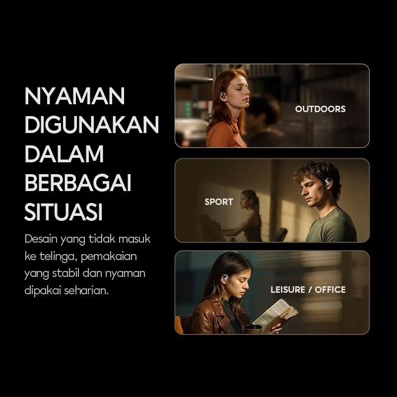 Earbud memiliki bentuk in-ear dengan desain sport hook yang pas di telinga, ideal untuk aktivitas fisilk seperti jogging, gym, dan olahraga outdoor.